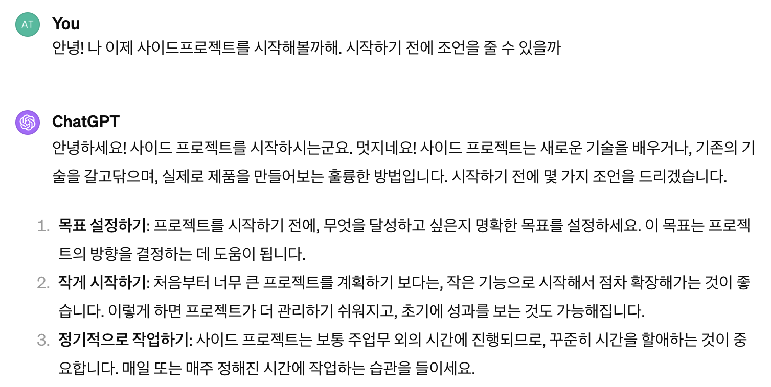 그리고 GPT에게 사이드프로젝트를 어떻게 시작할지 조언을 요청했다