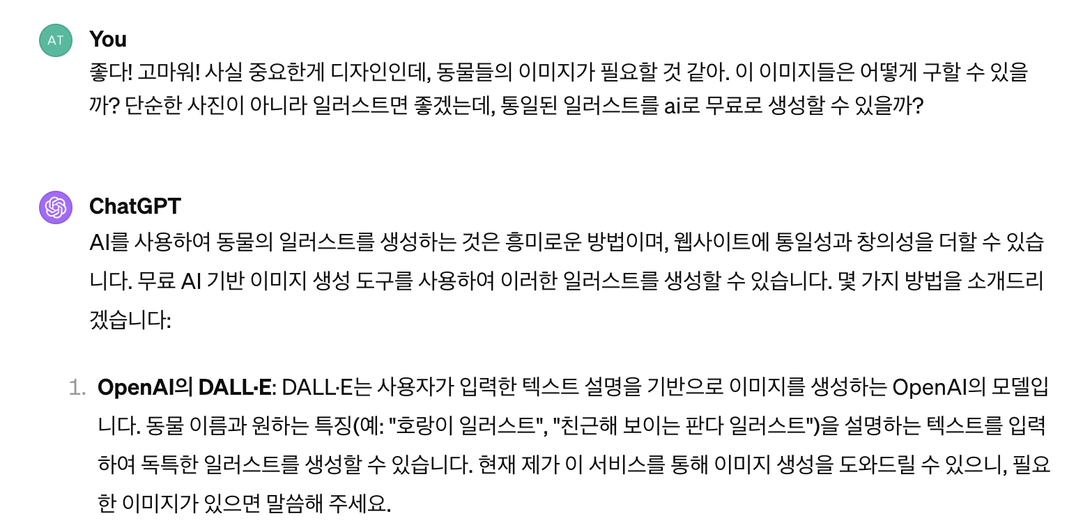 마지막으로는 제일 고민이 됐던게 동물 이미지를 어떻게 만들 것인가인데 지피티는 역시 능력있는 팀원이었다