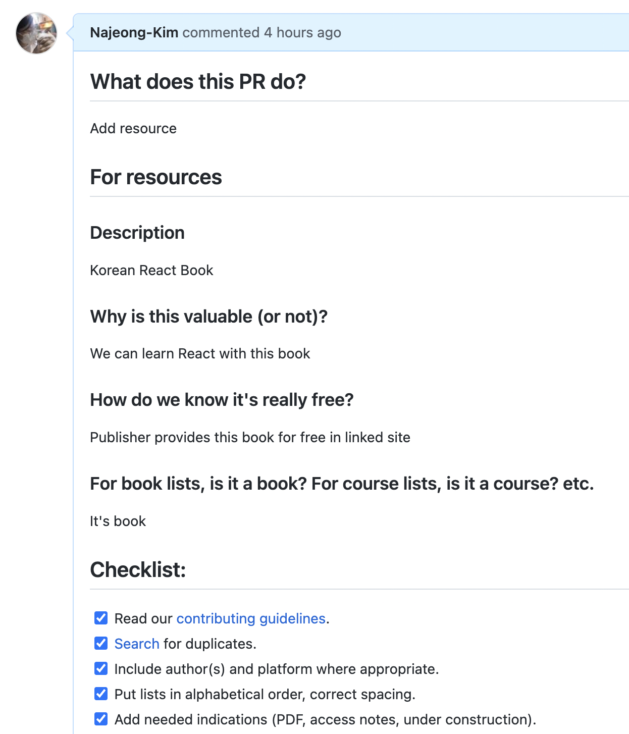 이런 식으로 pr 가이드라인이 있는 경우도 있어서 잘 지켜서 올려야돼요!